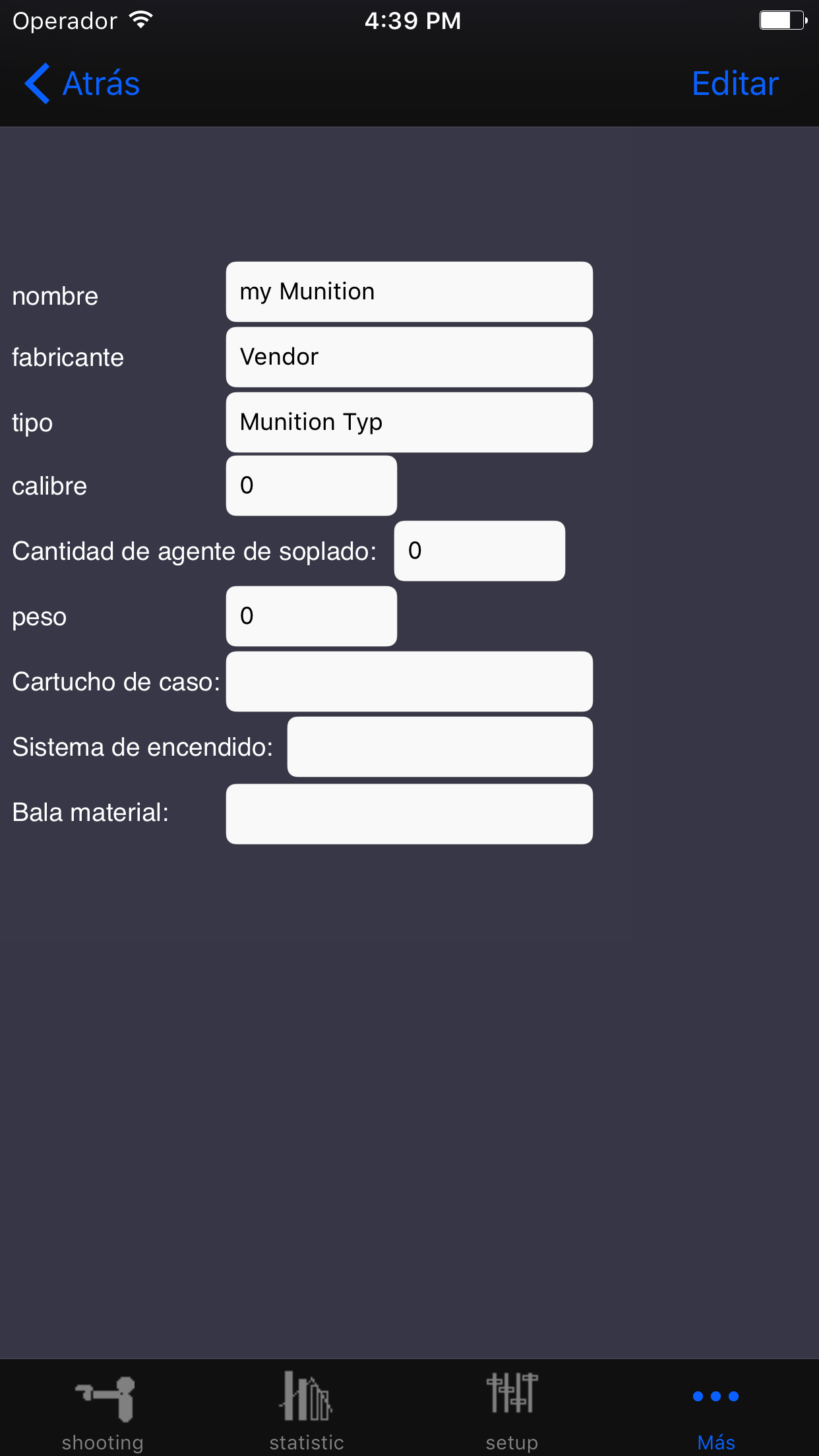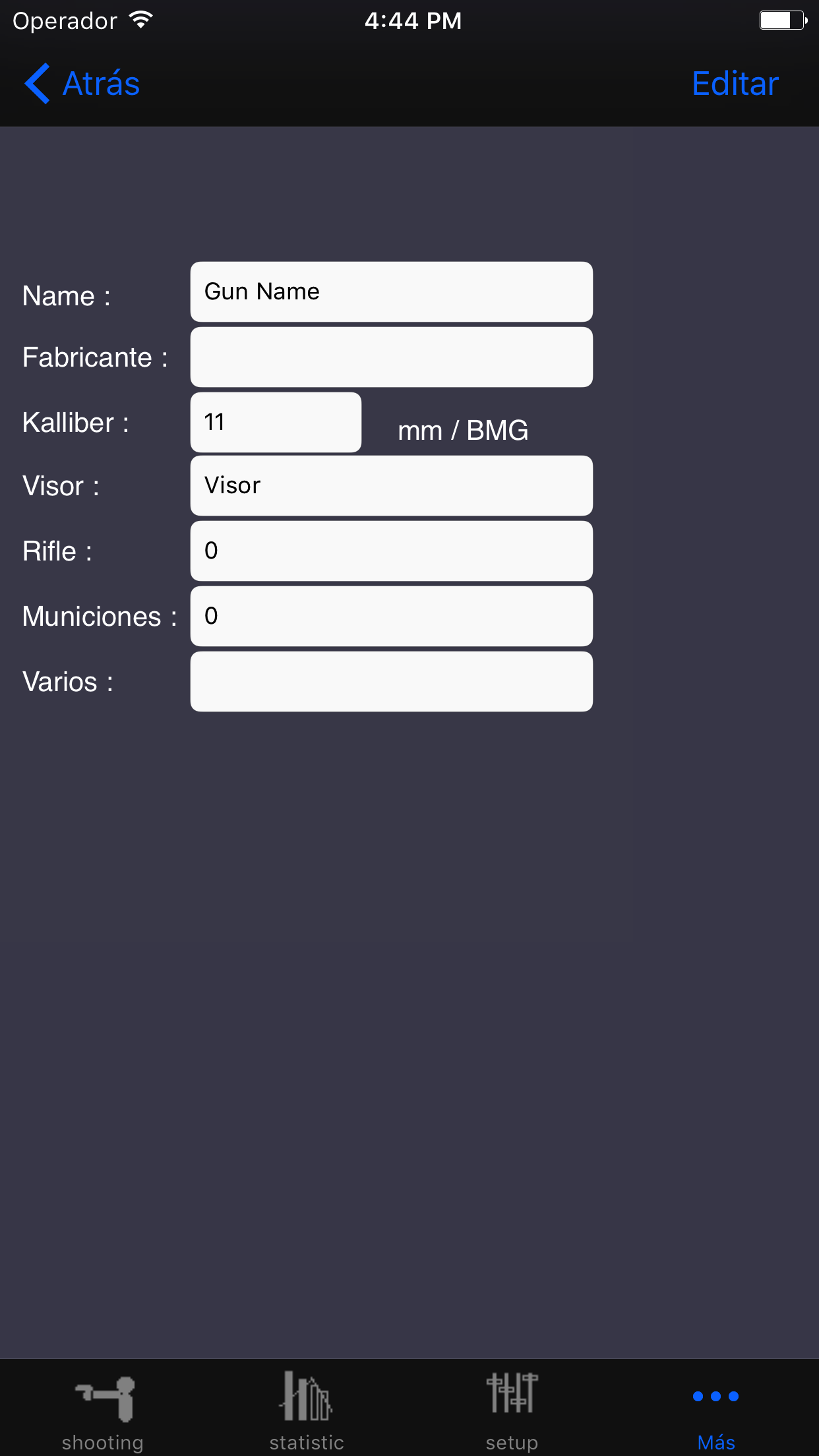 Aquí usted proporciona un parámetro para la aplicación. Puede eliminar todos los resultados de la toma y borrar los datos de disparo de armas y los datos juntos o comenzar a reparar las bases de datos para los problemas con la aplicación. Aquí también se puede establecer si el agitando el iPhone o eliminado durante la entrada de datos toda definir si desea recibir un mensaje cuando comienza un nuevo juego.