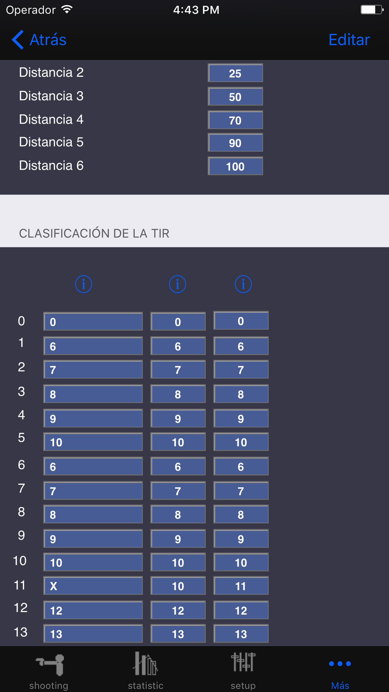 Si la plantilla que la aplicación ya no tiene suficiente, puede crear propias plantillas aquí. Usted puede tomar terminado Y luego copiarlos, entonces, p. Cosas individuales. Puedes crear plantillas muy propias y luego también estas Más tarde en el rodaje. Para realizar una entrada, debe liberar la edición tocando Editar. En el grupo "Plantillas", el campo de entrada superior es el nombre de la plantilla, es libremente seleccionable. Hay un campo de selección donde puede seleccionar el tipo, estándar, multidivisa o multizähler. Número de clasificaciones indica el número de líneas en la tabla del grupo "Rating of shots". En el grupo "Información", puede describir la plantilla. La distancia de grupo incluye el número de disparos por serie y el número de series por conjunto. A continuación, puede introducir varias distancias diferentes. El grupo "Rating of Shots" tiene tres columnas. La primera columna muestra el nombre del campo de entrada que se muestra cuando se ingresa. La segunda columna muestra el número de disparo en el que se disparó. La última columna muestra la puntuación correspondiente al campo de entrada respectivo. Si desea crear sus propias plantillas, puede copiar las plantillas existentes y realizar estos ajustes, lo que facilita la creación de su propia plantilla.