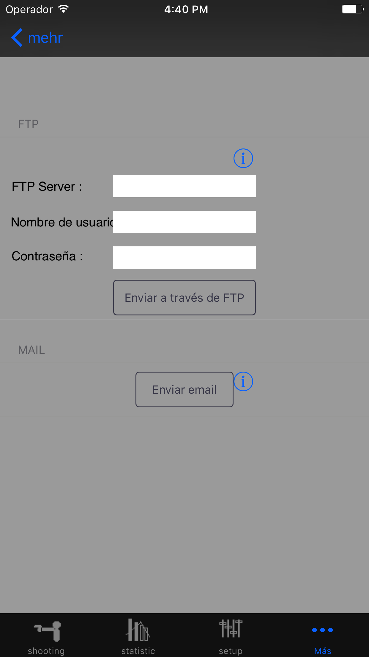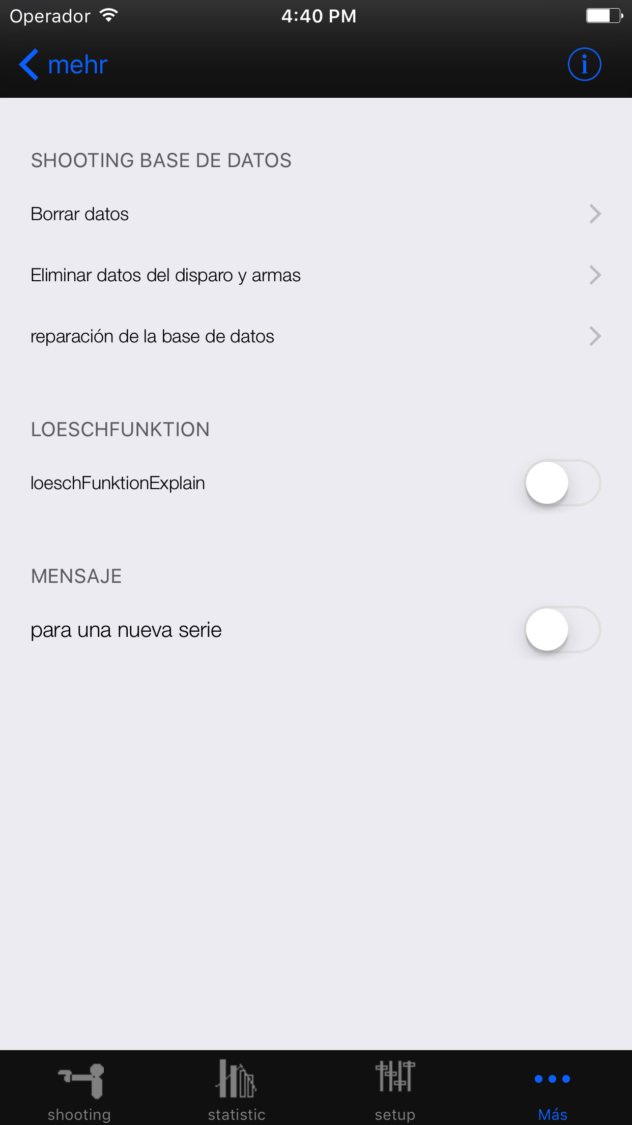 Aquí usted proporciona un parámetro para la aplicación. Puede eliminar todos los resultados de la toma y borrar los datos de disparo de armas y los datos juntos o comenzar a reparar las bases de datos para los problemas con la aplicación. Aquí también se puede establecer si el agitando el iPhone o eliminado durante la entrada de datos toda definir si desea recibir un mensaje cuando comienza un nuevo juego.