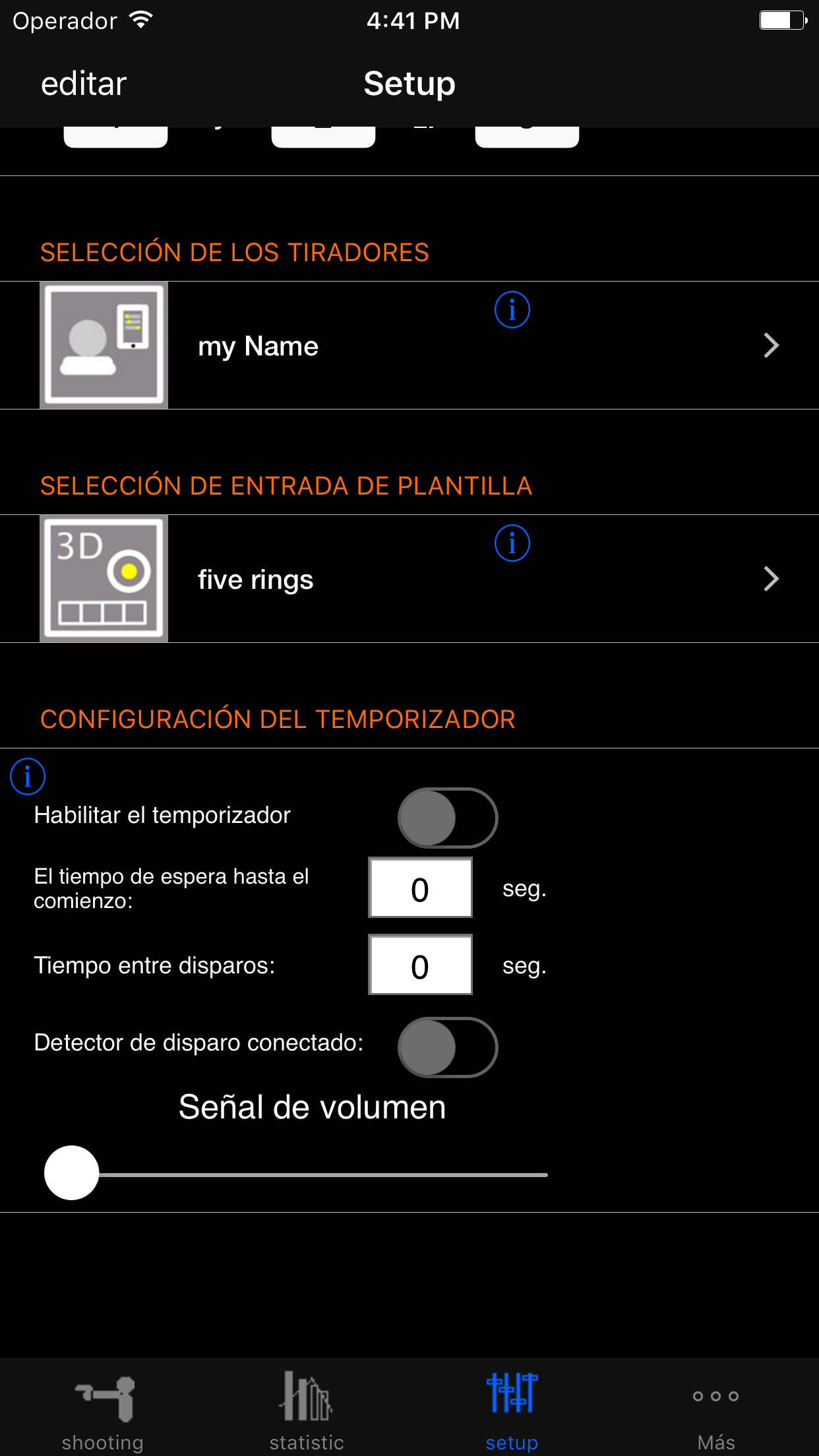Aquí se pone el número de vueltas por serie y el número de disparos por ronda. La configuración de su Visera, también puede entrar aquí no se almacena para cada disparo el ajuste adecuado. puede introducir sus ajustes específicos bajo el tirador de punto, por ejemplo, con lo arma que dispara o el cual municiones. ¿Quieres los resultados del registro de varios tiradores por lo que también puede seleccionar los tiradores aquí. La elección de las armas, municiones y disparos, sólo se puede hacer si -Más- previamente en el menú en consecuencia han invertido en las respectivas bases de datos protegen, armas y municiones. En la imagen a modo de ejemplo 2 rondas por serie se establecen aquí y 5 disparos por ronda a una distancia de 18 m. Los ajustes de avistamiento se pueden ajustar a voluntad. Como un juego de acción se selecciona aquí sólo un juego de acción, aquí se puede seleccionar e introducir las zonas de puntuación para varios tiradores. Como plantilla de entrada se selecciona la plantilla por defecto aquí, también se puede velocidad de disparo pero seleccione simplemente crear sus propias plantillas utilizando la plantilla de menú en el menú principal "más". Las nuevas entradas se introducen siempre sólo después de inicio de la nueva serie.